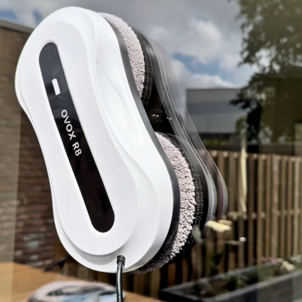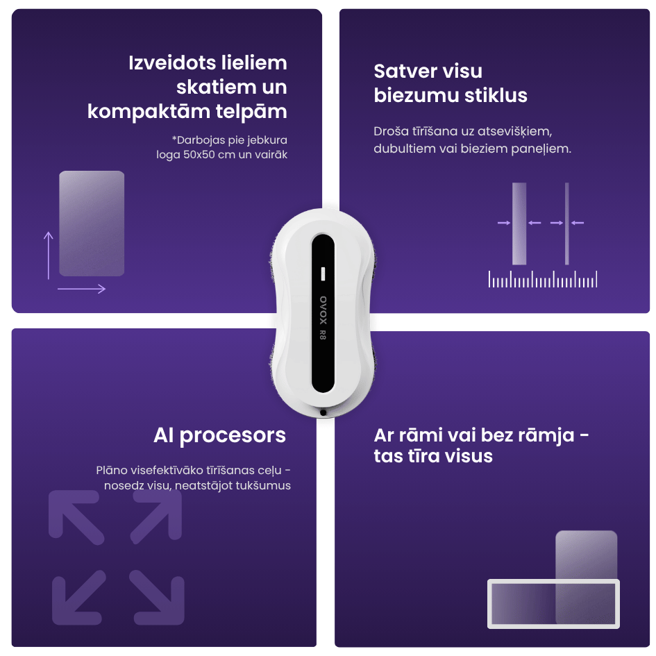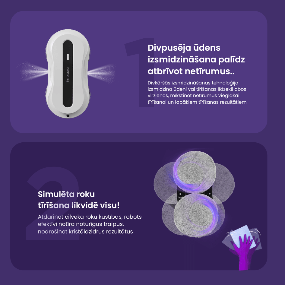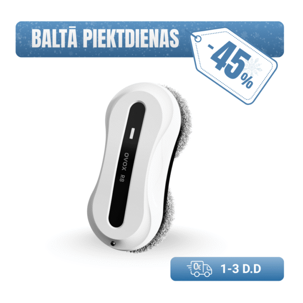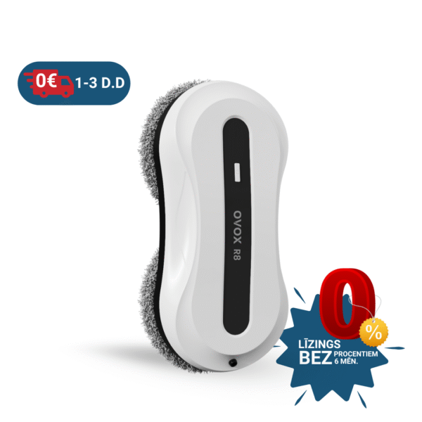 Logu tīrīšanas robots OVOX R8 – divkāršāizsmidzināšana, simulēta manuāla tīrīšana, viedā navigācija, bezrāmju malu noteikšana, pielāgots dažādām virsmām.