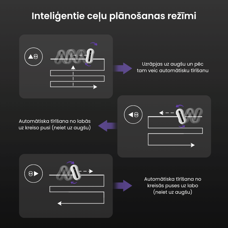 Inteliģentā ceļa plānošana optimizē tīrīšanas efektivitāti, kartējot virsmu un sekojot visefektīvākajam maršrutam, nodrošinot pilnīgu pārklājumu, nepalaižot garām nevienu vietu