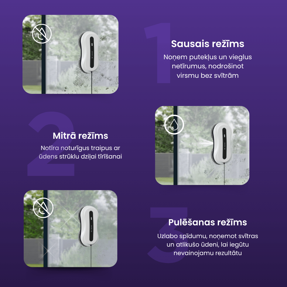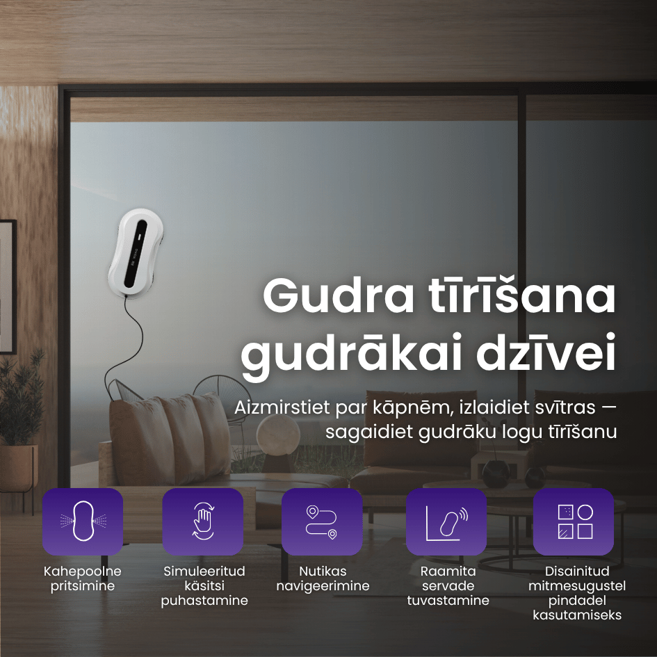 Man ļoti patīk šis robots. Tas izskatās lieliski uz loga, un tas pat izsmidzina no abām pusēm! Pirmo reizi ieslēdzot, mazliet uztraucos – vai nokritīs? Bet tas ļoti stingri pielipa, droši pārvietojās pa stiklu un visu lieliski notīrīja.
