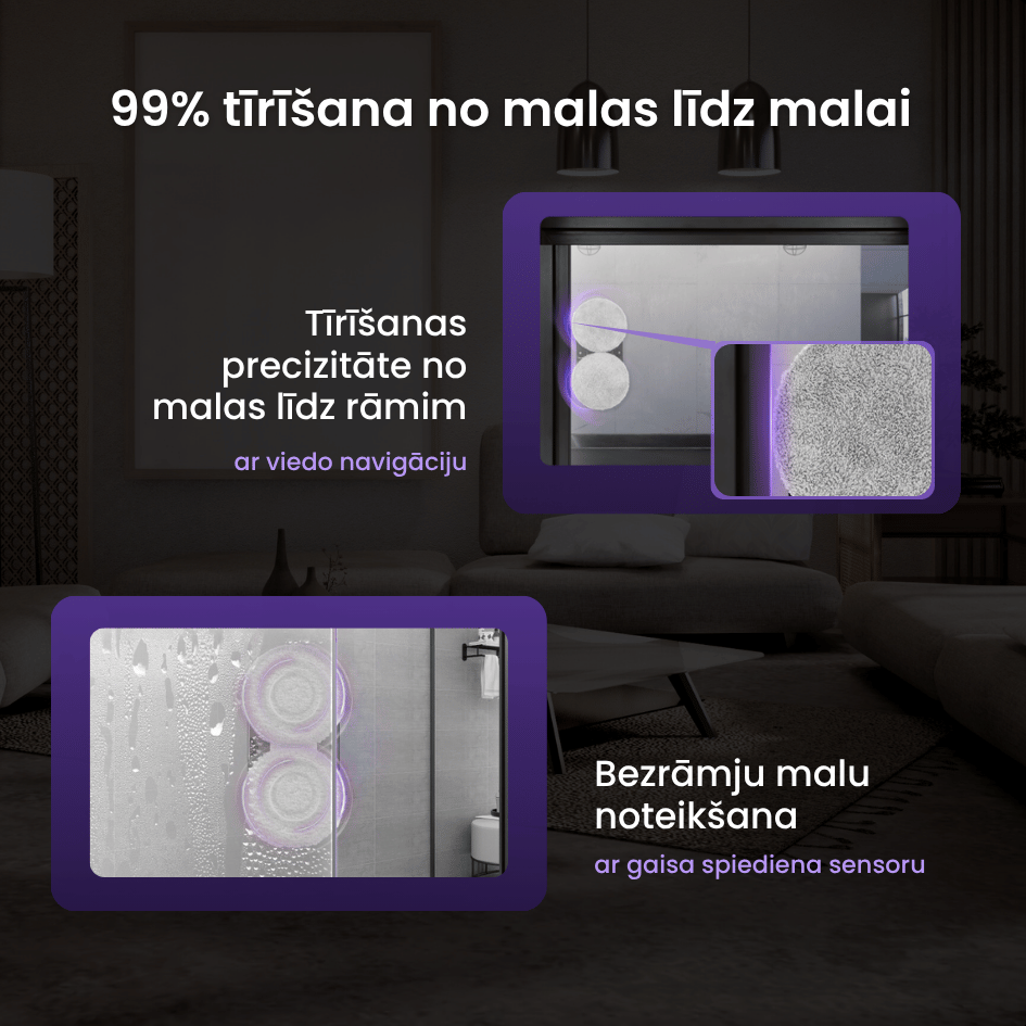 Tīrīšanas lupatiņas uz rotējošiem paliktņiem maigi sasniedz rāmja malas, noņemot netīrumus, nodrošinot rūpīgāku un pulētāku tīrīšanu nekā vairums logu robotu.