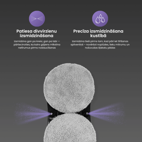 Kad robots izsmidzina ūdeni vai tīrīšanas šķīdumu, tas vienlaikus sadala un berzē to virsmā dziļākai tīrīšanai.